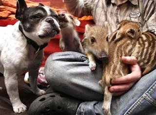 تبنّت كلبة حنونة من نوع بولدوج ستة خنازير برية صغيرة فقدت أمها في ألمانيا.