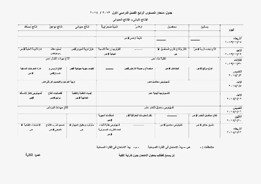 جدول امتحانات كلية الزراعة جامعة عين شمس التيرم الأول 2013/2014 جميع الفرق والأقسام